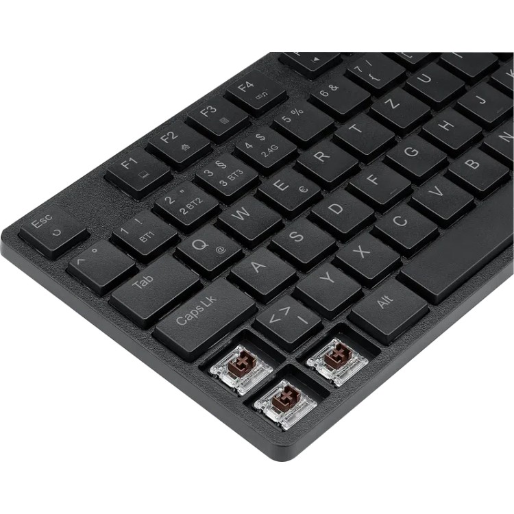 Ultra-thin mechanical keyboard with low-profile brown OUTEMU switches with adjustable RGB backlight. This model has 3 connection modes: wired, Bluetooth wireless mode (without adapter), 2.4GHz wireless radio connection (via USB adapter).